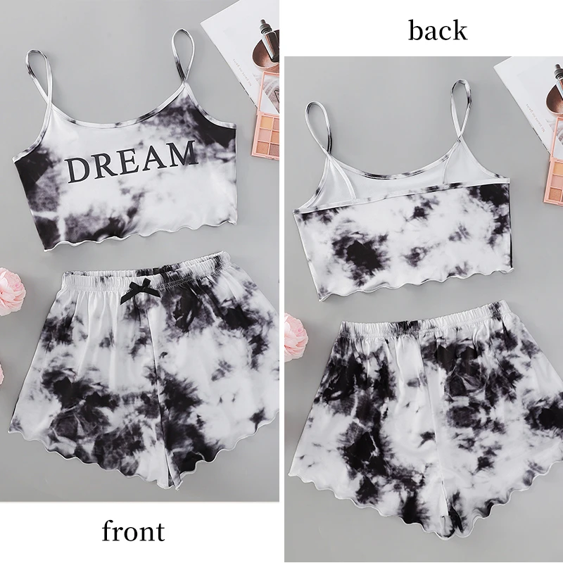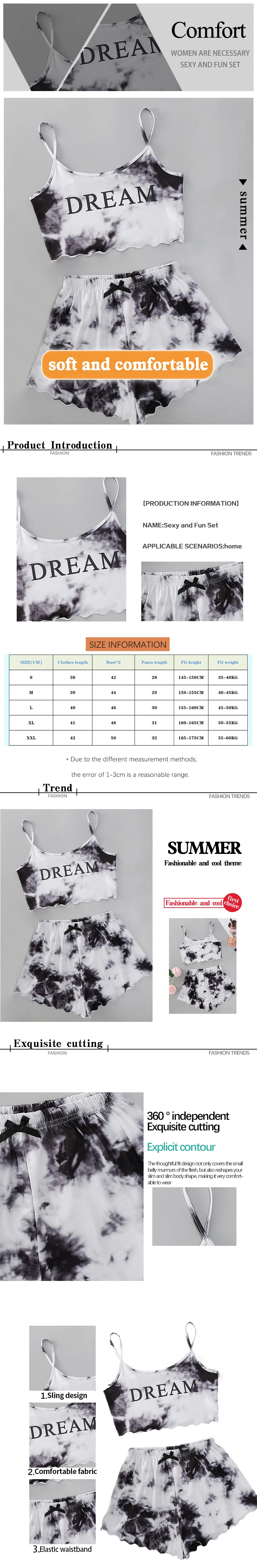 ملابس نوم مع أشرطة سباغيتي قابلة للتعديل، سترة كبيرة ذات رقبة مستديرة، شورت خصر مرن.