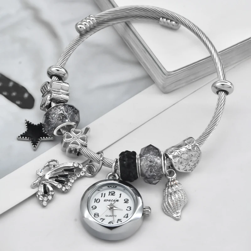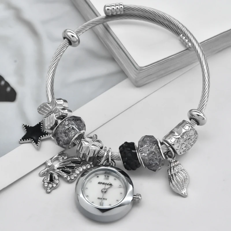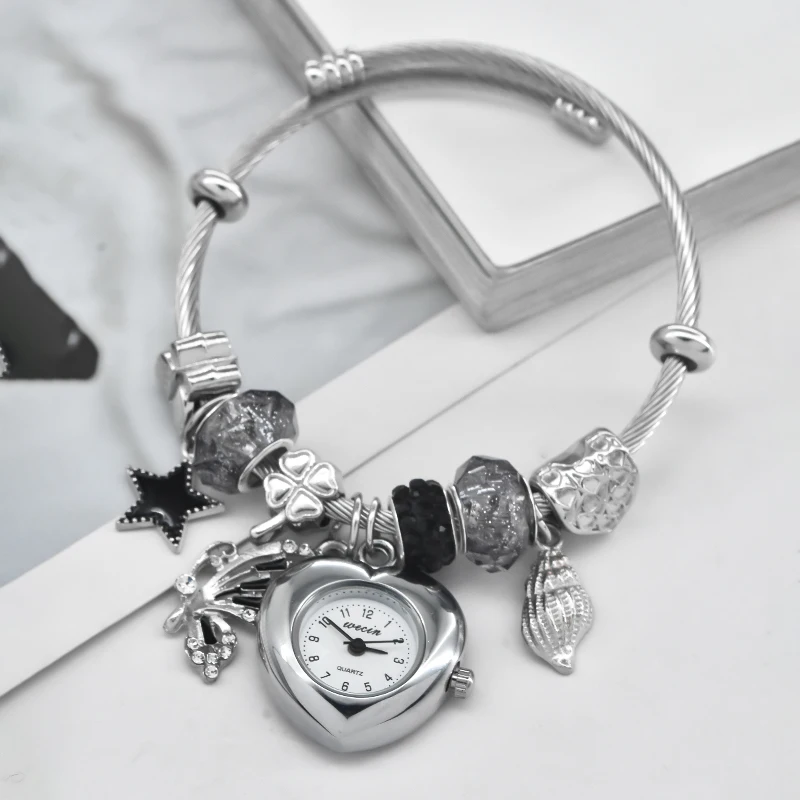 ساعة يد نسائية عصرية بسوار الحب مع ديكور أنيق، ساعة كوارتز مستديرة مكررة، أناقة كاجوال فضية