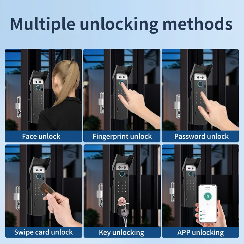 افتح القفل بسلاسة عبر التعرف على الوجه ثلاثي الأبعاد المتقدم، أو بصمة الإصبع، أو بطاقة RFID، أو كلمة المرور، أو تطبيق Tuya، أو المفاتيح المادية - مرونة لكل مستخدم.