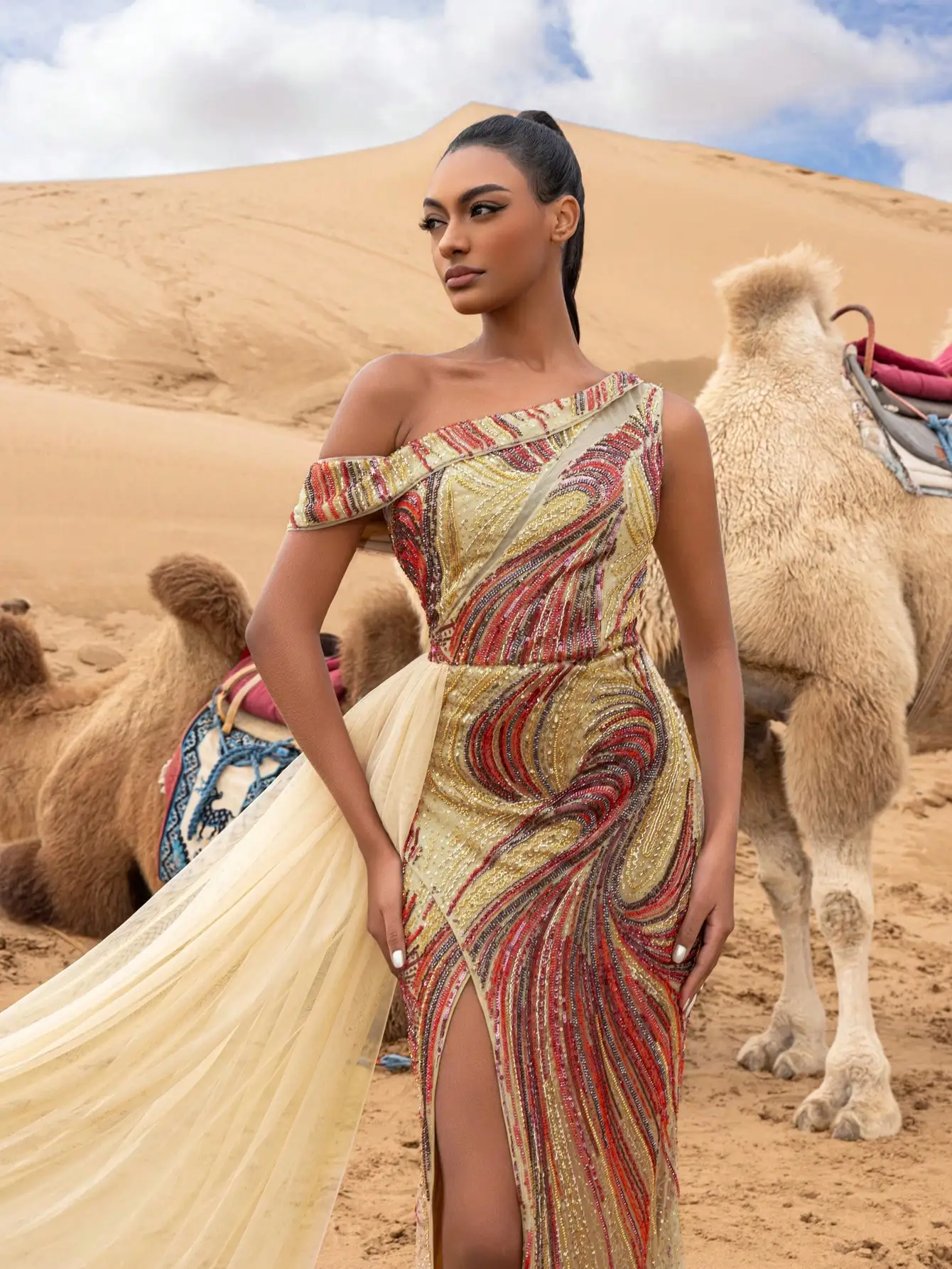 رائع منحدر الكتف تول رايات الجانب الرسم مطرز فساتين رسمية وفساتين السهرة