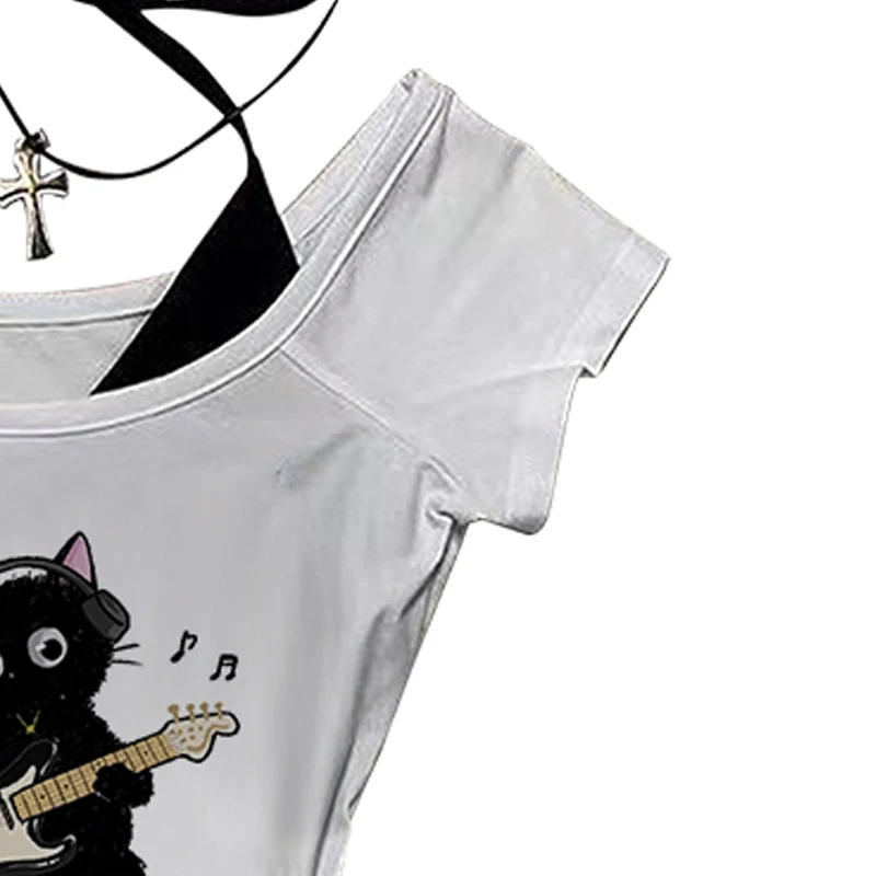 Y2k الجمالية القط نمط خمر الأساسية المحملات السيدات الملابس الرجعية الجرافيك الأعلى الأبيض قصيرة الأكمام عارضة تي شيرت للنساء