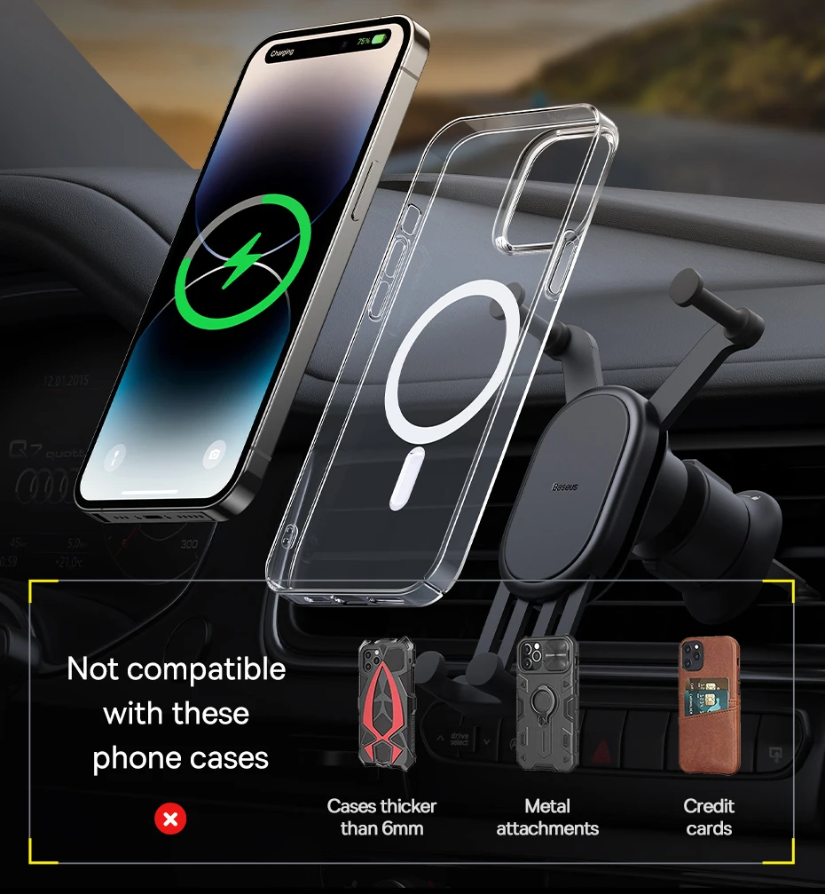 لا يوجد توافق مع أكثر سمكًا من 6 أو الملحقات المعدنية/بطاقات الائتمان