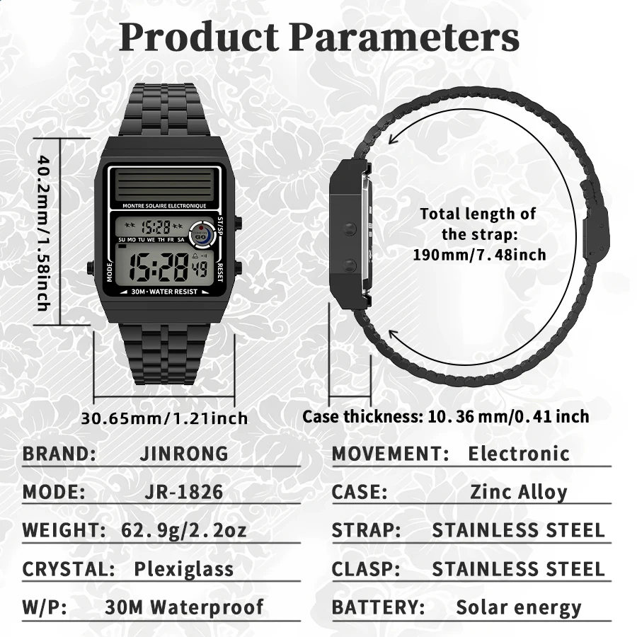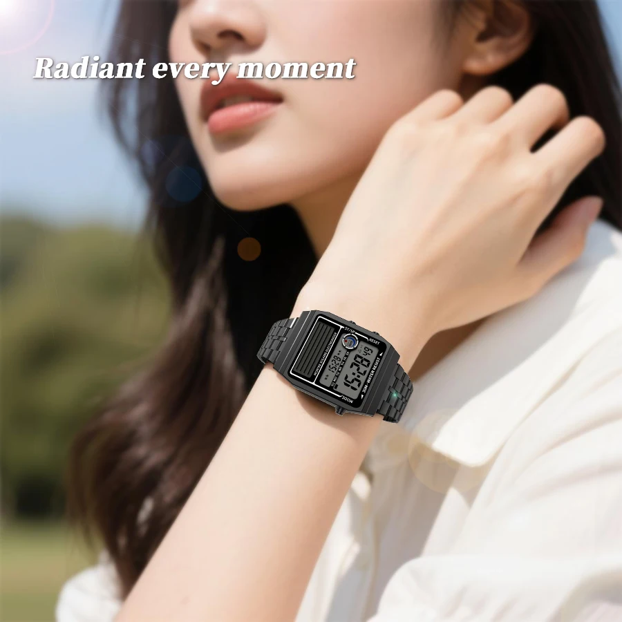 تتميز الساعة بحزام متين من الفولاذ المقاوم للصدأ، مما يوفر الأناقة وطول العمر.