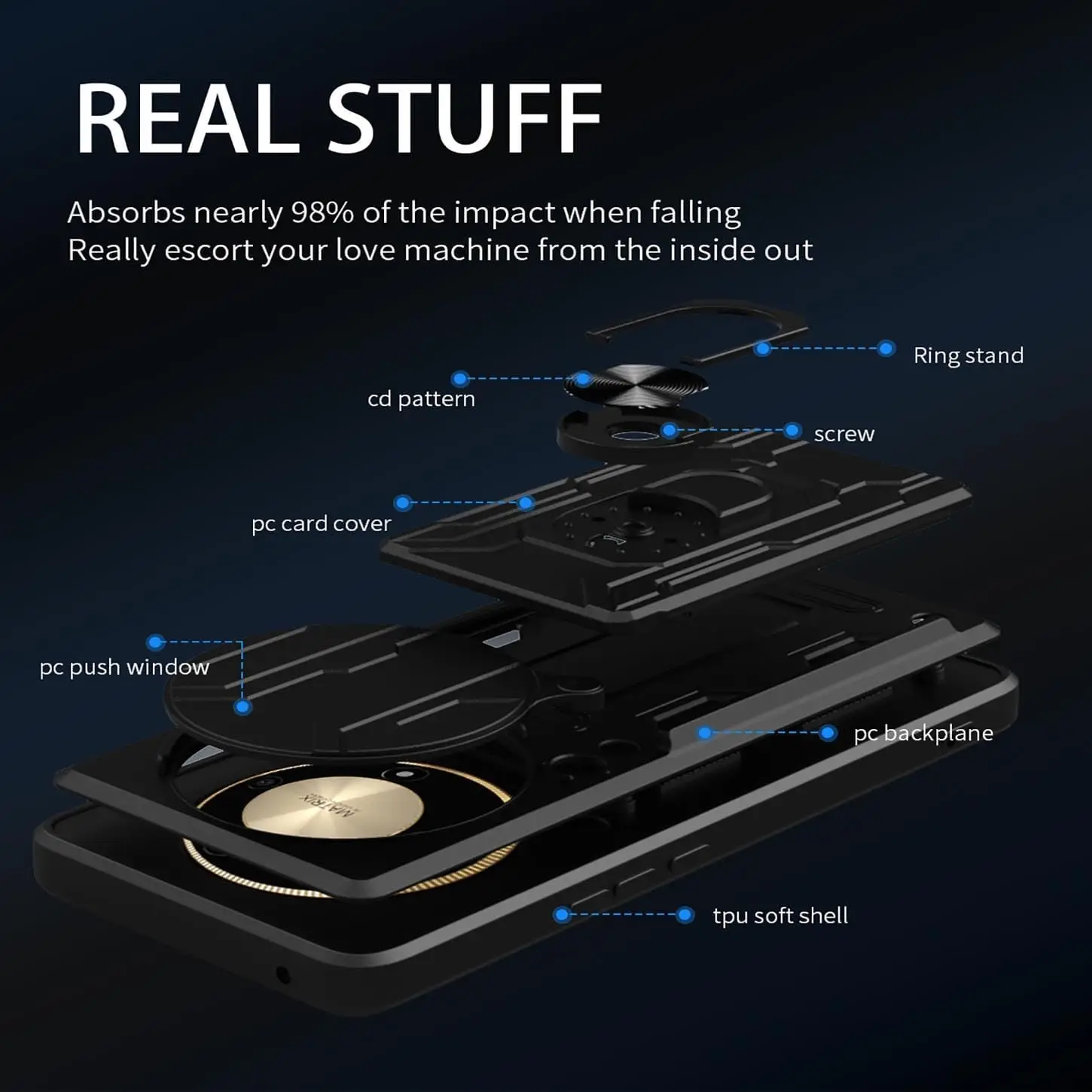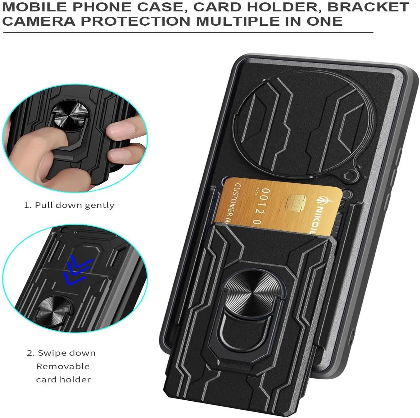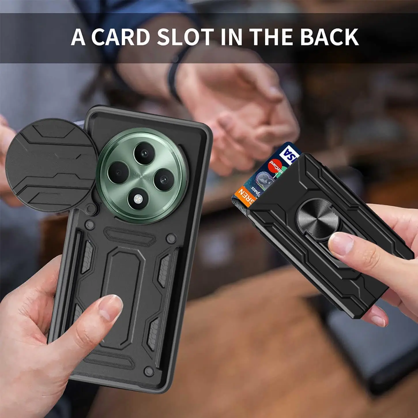 الوصف --حامل الحلقة: يتميز بحامل قبضة الإصبع الدائري الذي يوفر لك حملًا وتشغيلًا مريحًا بيد واحدة. تدور الحلقة 360 درجة ويمكن استخدامها كحامل --ملاءمة مثالية: حافظة درع واقية مزدوجة الطبقات مناسبة تمامًا لهاتفك أقصى قدر من الحماية: يجمع بين غطاء طبقة TPU القوي الممتص للصدمات والغطاء الصلب من البولي كربونات (PC). --فتحة بطاقة مدمجة: يمكنك وضع بطاقة الائتمان، وهي مناسبة جدًا ومتوافقة مع الأنشطة الخارجية. --حماية إضافية: يغطي الحواف بالكامل وكل زاوية تحتوي على وسادة إضافية لحماية هاتفك من السقوط والخدوش والصدمات. --فتحات دقيقة: تتيح سهولة الوصول إلى جميع ميزات الهاتف دون إزالة الجراب. لوحة مغناطيسية مدمجة: تسمح باستخدام الحافظة مع حاملات مغناطيسية