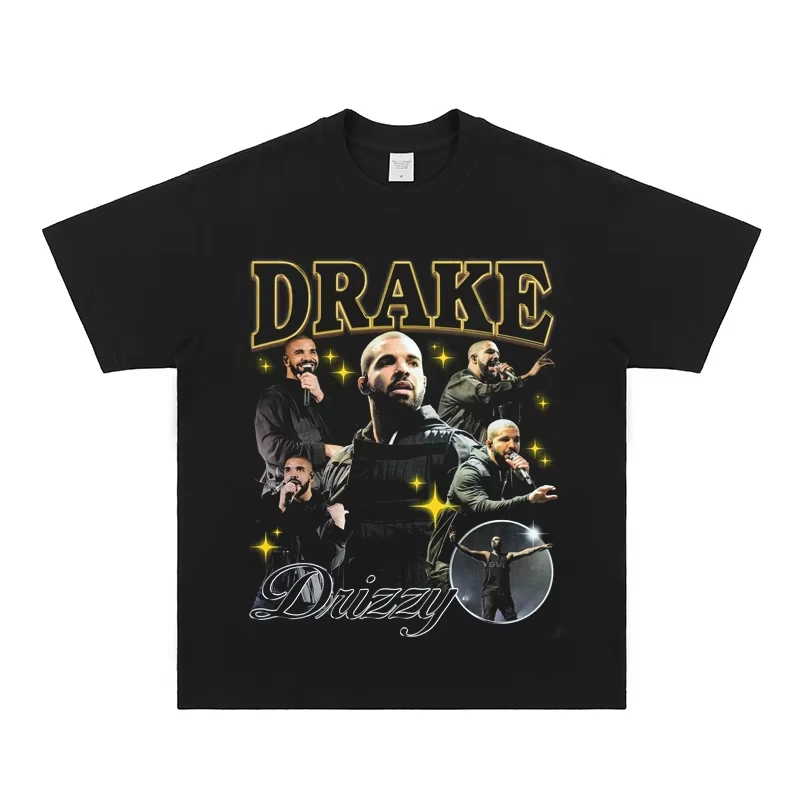 2025 الصيف دريك خمر المحملة الرجال والنساء دريك تي شيرت تقليدي مطبوعة الأمريكية عادية خمر القطن قصير الأكمام