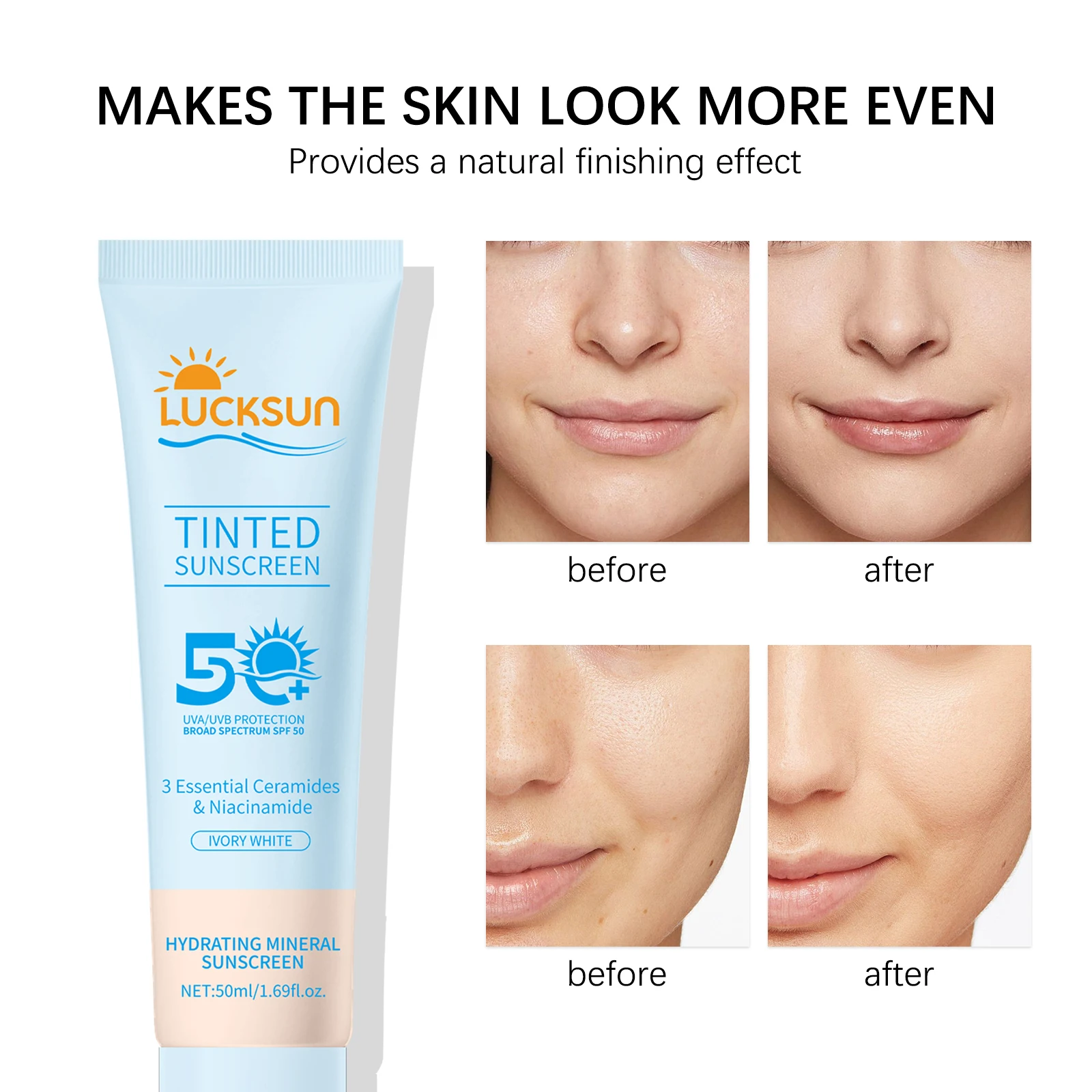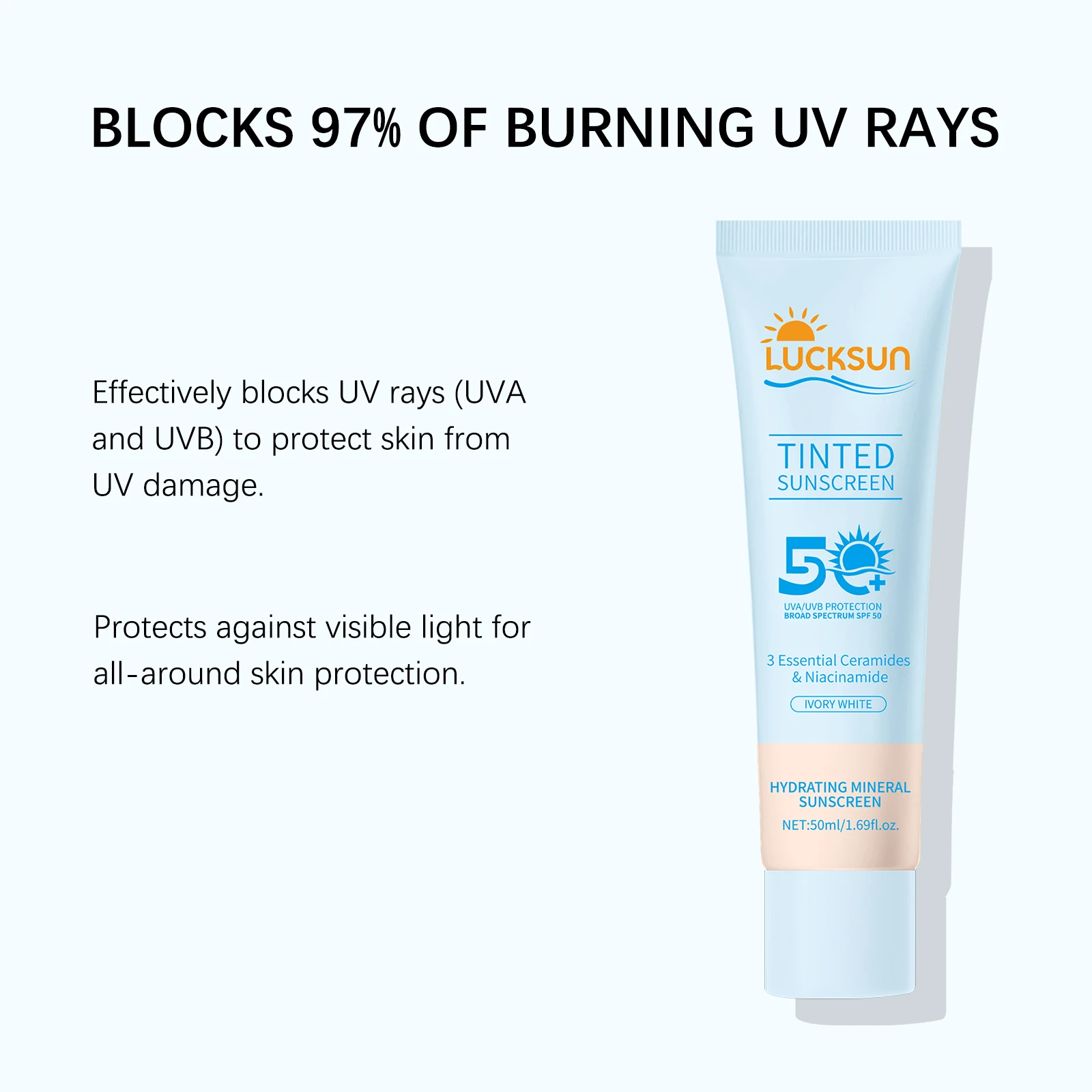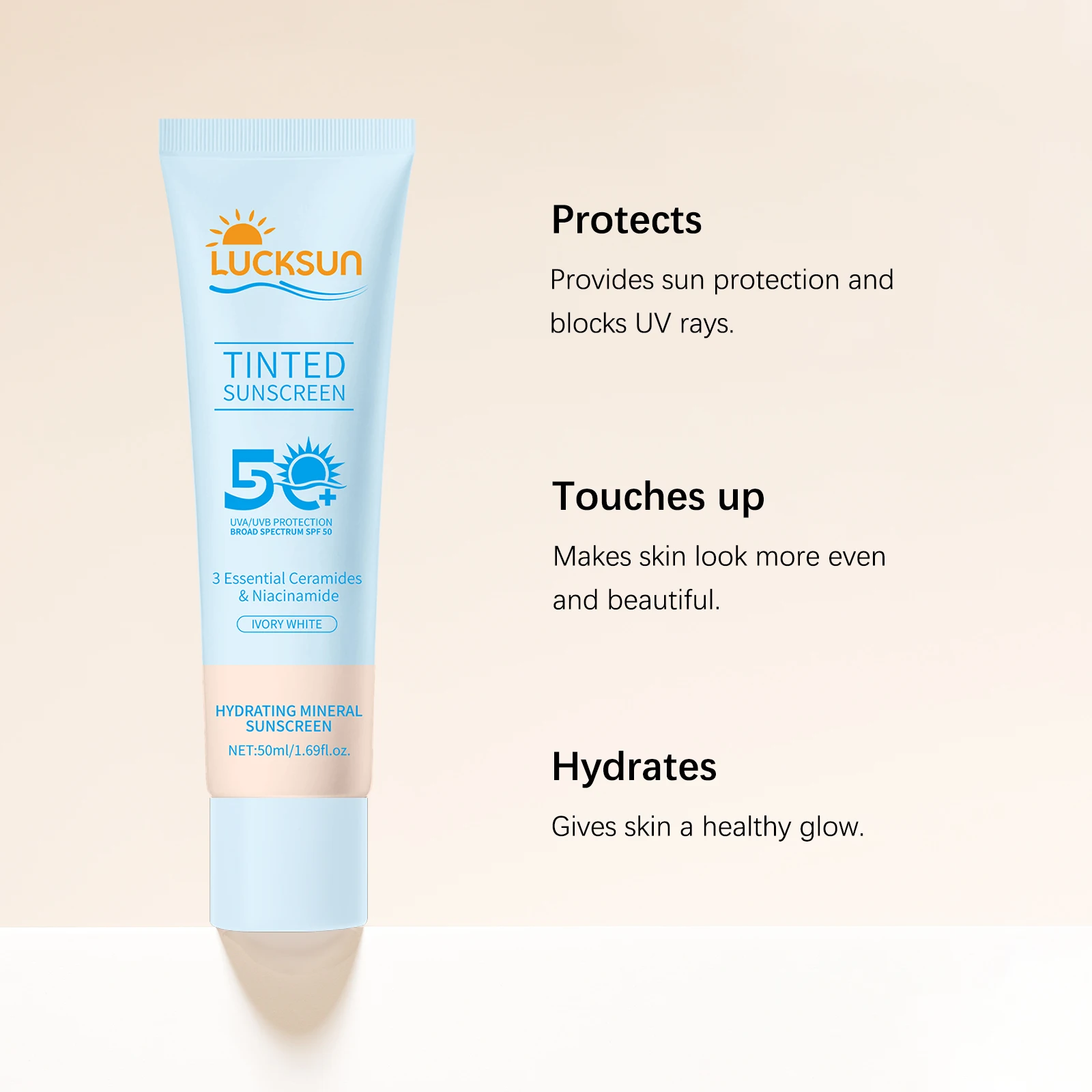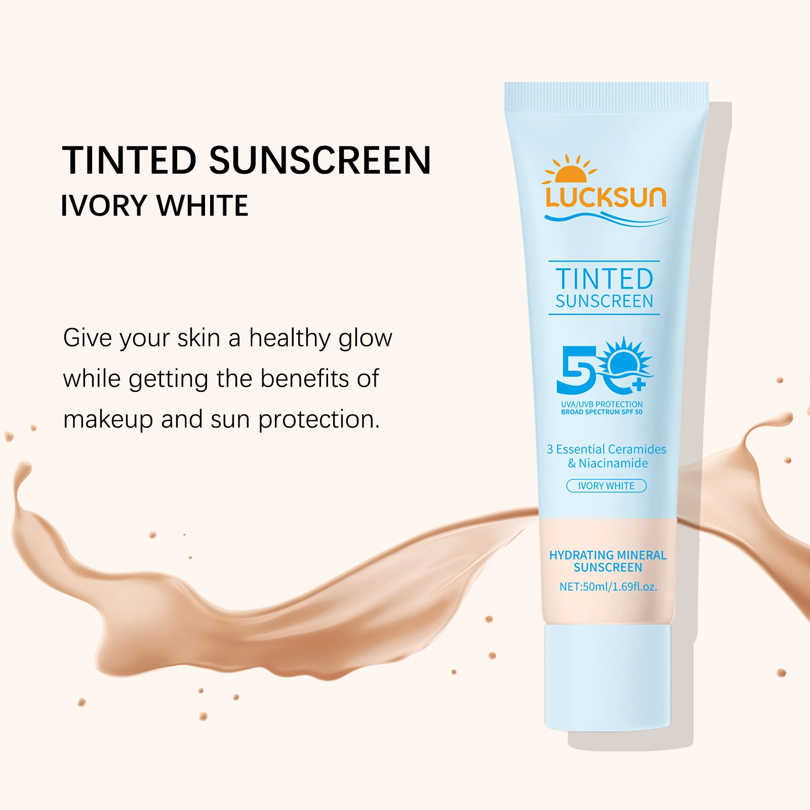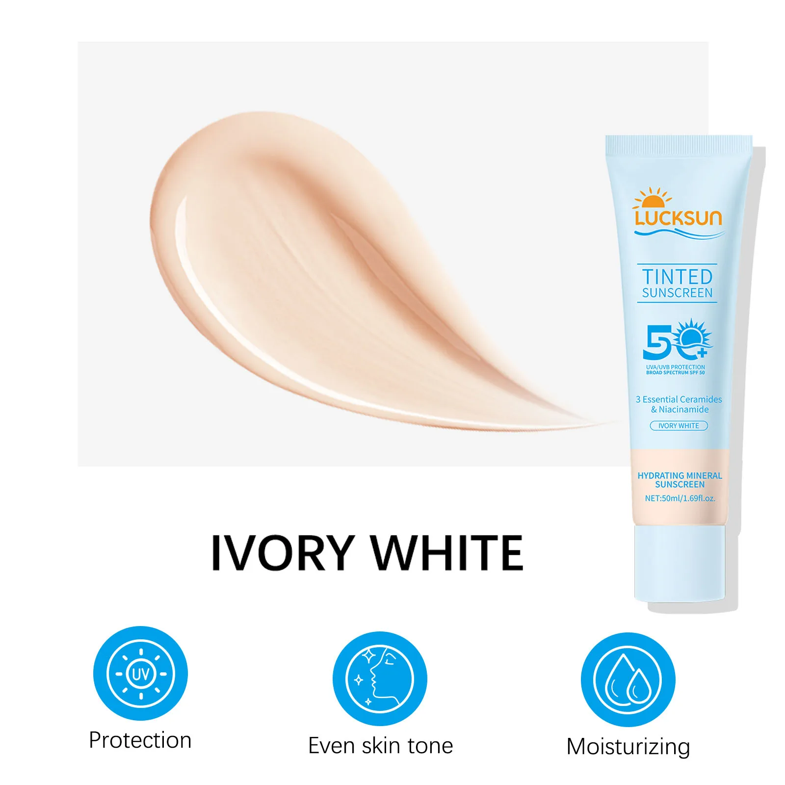 LUCKSUN 50ml Ivory White Tinted Sunscreen SPF 50 Hydrating Makeup Base Even Skin Tone Sun Protection Cream fit Cool/Warm/Neutral Skin